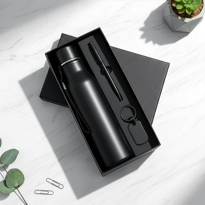 Modern Slimline 3-Piece Gift Set: Vacuum Bottle, Pen & Keychain (Black/White)