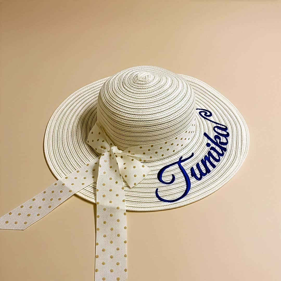 Achieve instant resort elegance with the perfect women beach hat custom designed for sunny days. This lightweight, wide-brim hat in a crisp ivory shade offers superior sun protection and a classic aesthetic. It’s beautifully accented by a stylish gold polka dot ribbon bow. Make it truly unique by personalizing it with your name in vibrant blue script embroidery—a stunning, eye-catching customization that makes a statement.