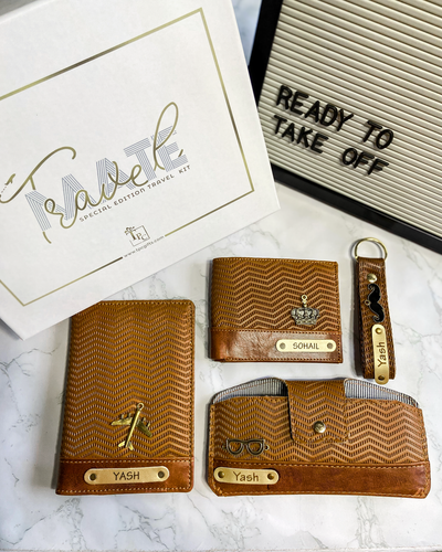 The Travel Set Gift Hamper - Ziggy Brown is an all-in-one travel companion designed to cater to the needs of modern travelers. This luxurious set includes essential items such as a passport cover, sunglass cover, keychain, and a mens wallet. Each piece is meticulously crafted from premium imported Italian leather and can be customized with names or charms, making it a perfect gift for any occasion celebrated in India.