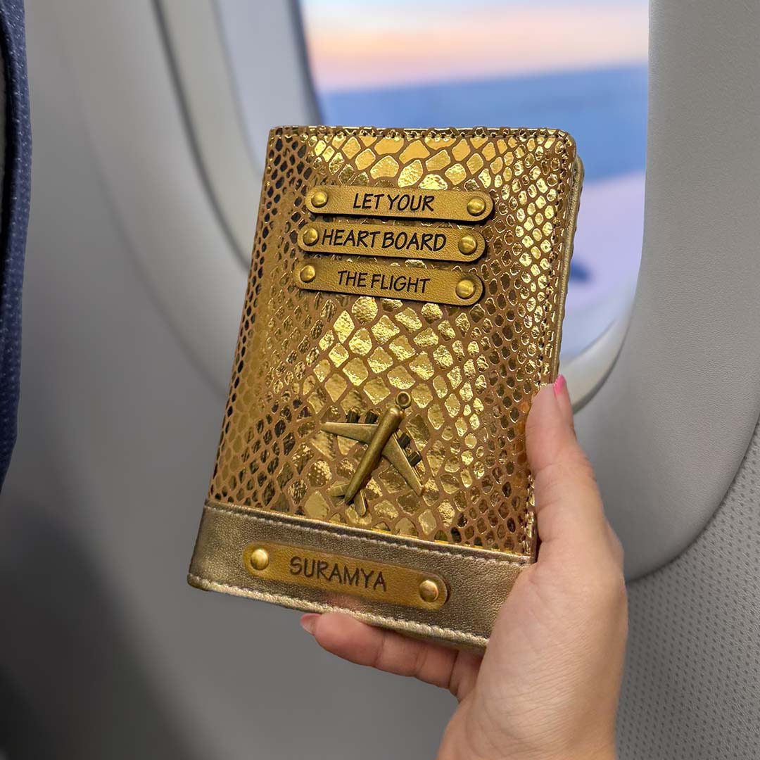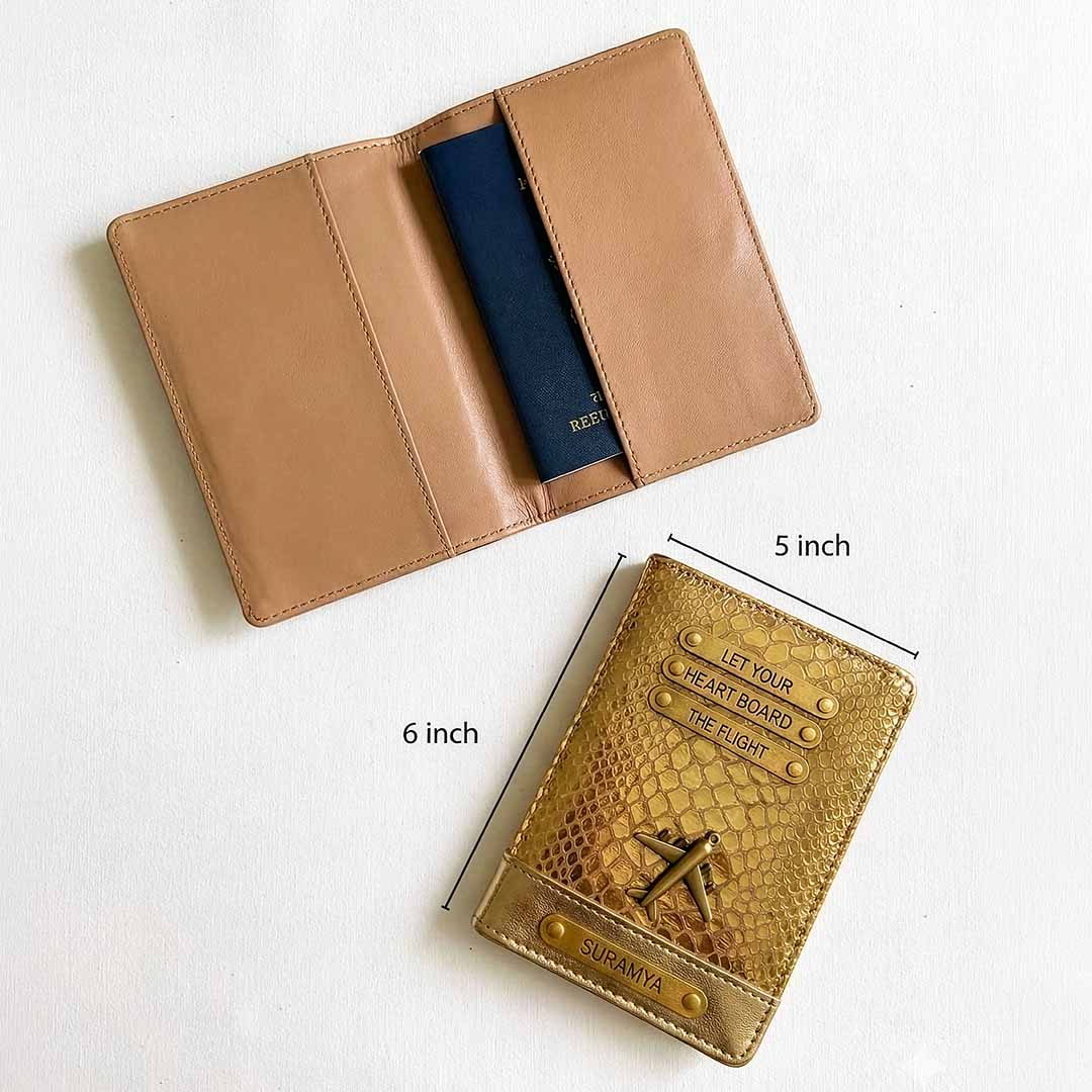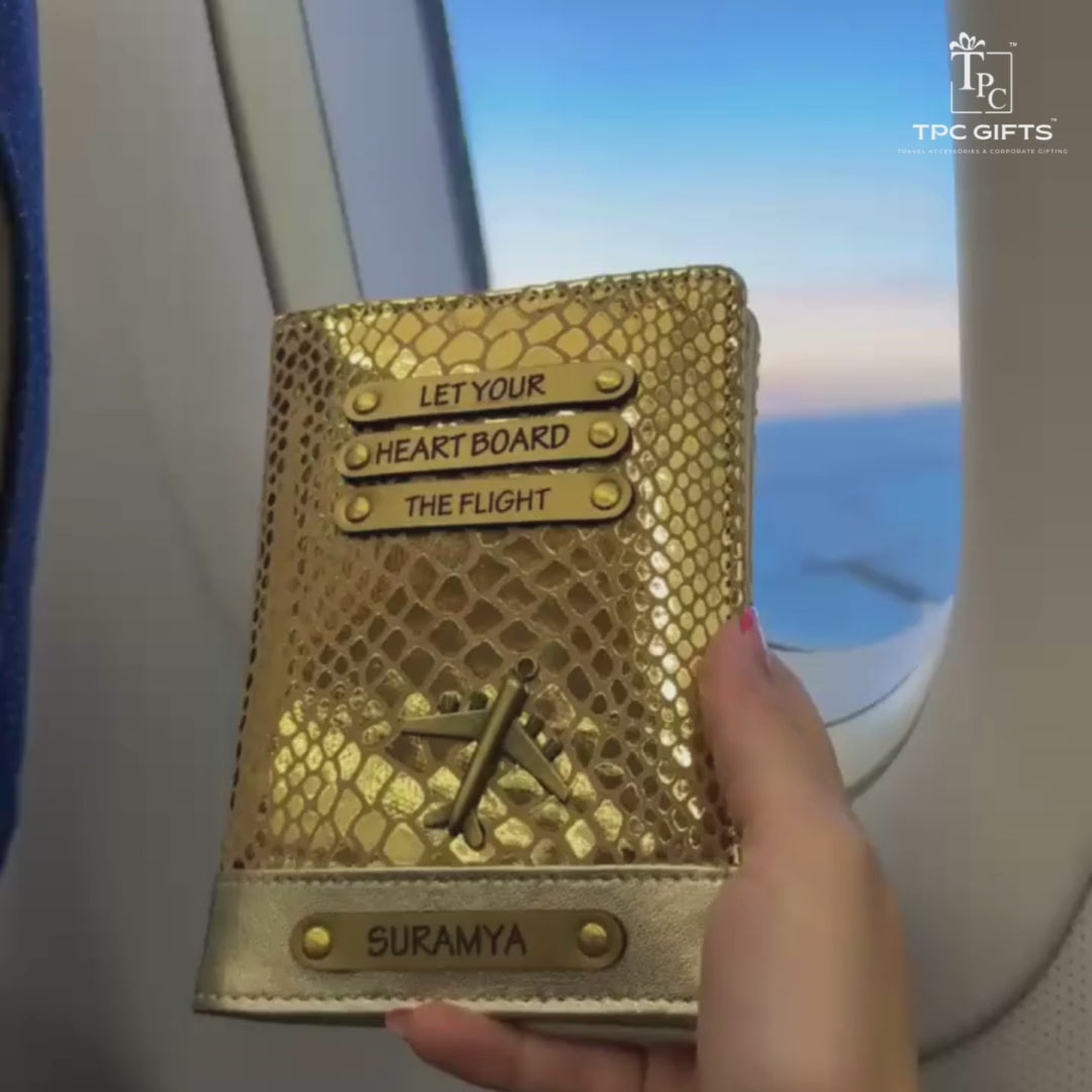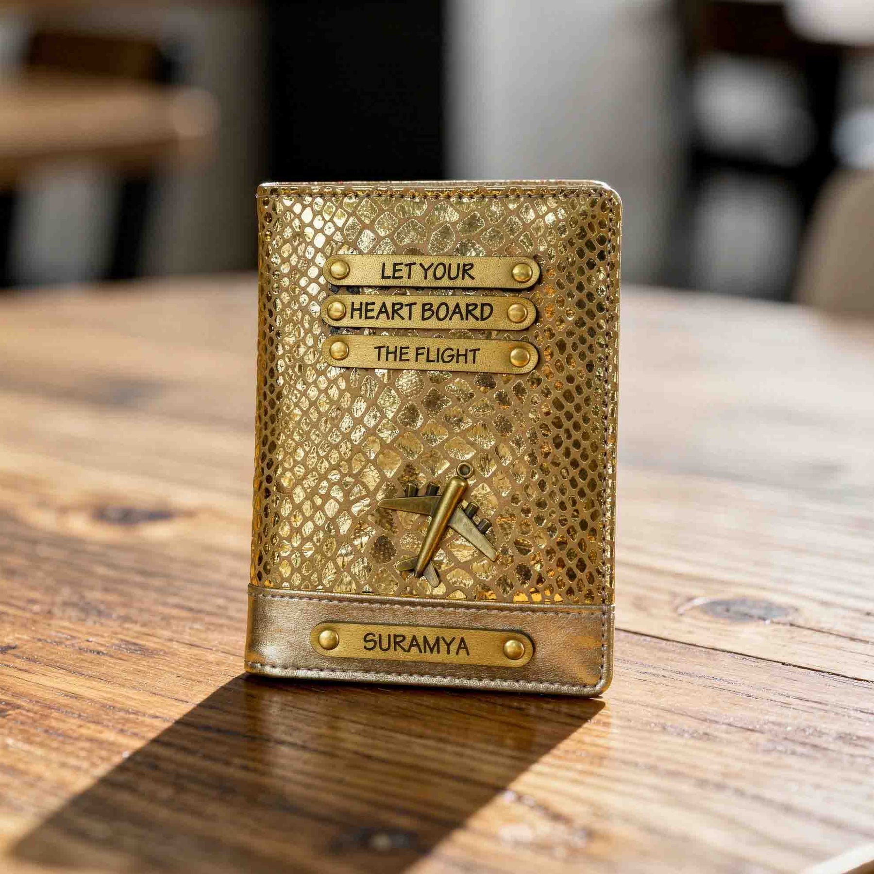 With its radiant gold finish, textured pattern, and custom name embossing, this designer passport cover turns an everyday travel essential into a statement accessory. Whether you’re flying solo, gifting someone special, or planning a honeymoon, this cover adds meaning to every journey.
