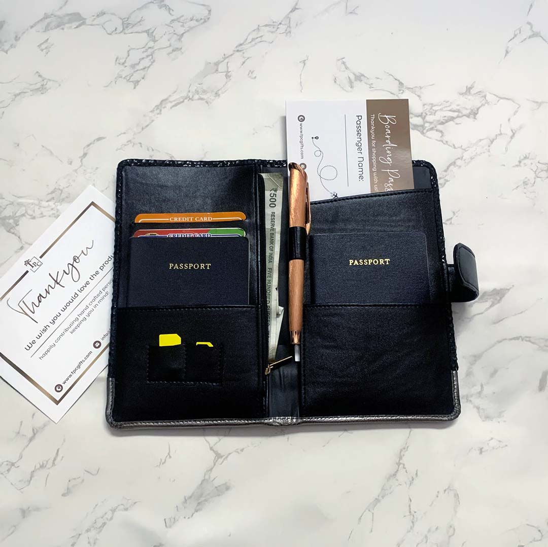 - Don't let your wallets cramp up your essentials. Designed to be compact yet spacious, this croco travel organizer is a handy tool to keep your valuables together and safe.